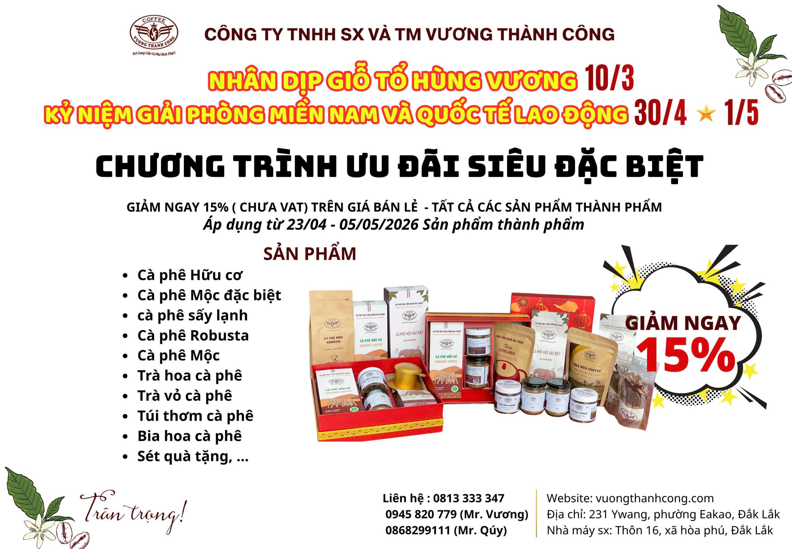 Hòa chung không khí tri ân các ngày lễ lớn: Giỗ Tổ Hùng Vương (10/3), Kỷ niệm Giải phóng Miền Nam 30/4 và Quốc tế Lao động 1/5, Công ty Vương Thành Công chính thức triển khai chương trình ưu đãi quy mô lớn dành cho đối tác và khách hàng trên toàn quốc.