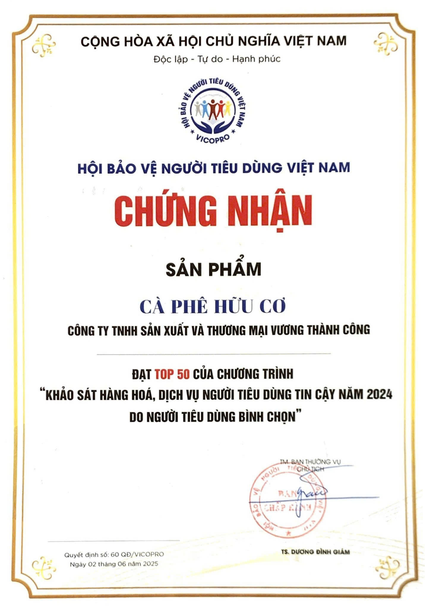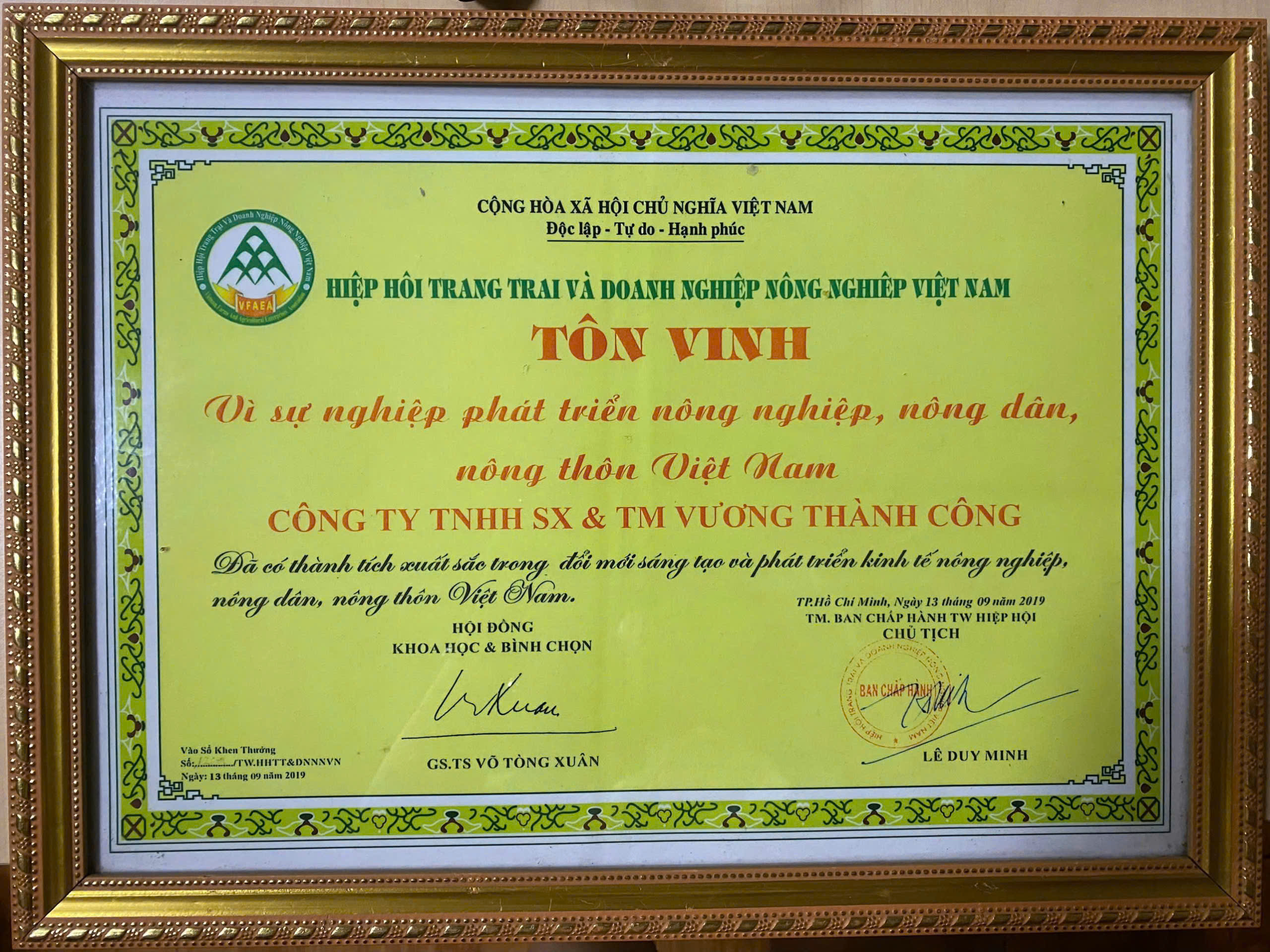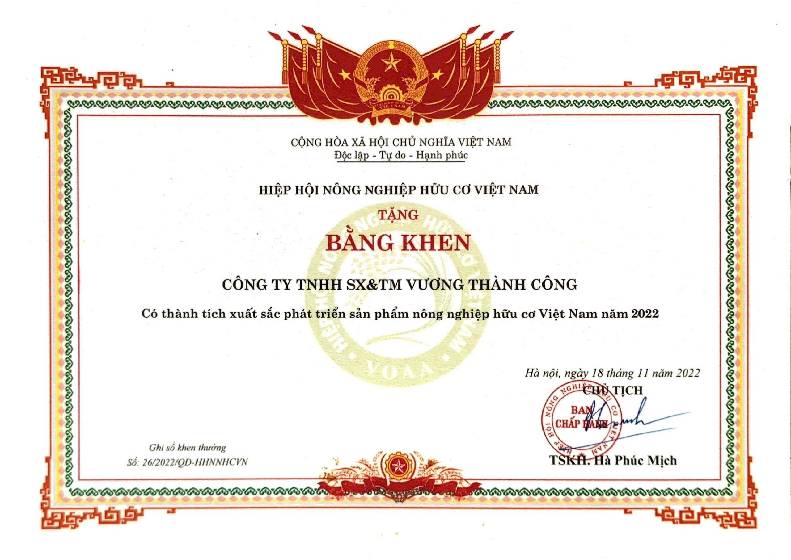 - Bằng khen nông nghiệp hữu cơ Việt Nam