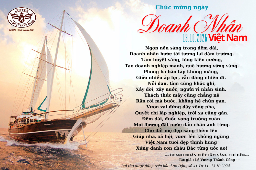 Nhân kỷ niệm Ngày Doanh nhân Việt Nam 13/10, Công ty Vương Thành Công kính chúc các cấp Lãnh đạo địa phương cùng toàn thể cộng đồng Doanh nhân luôn dồi dào sức khỏe, tự tin, phát huy bản lĩnh, tinh thần đổi mới sáng tạo, luôn vững tâm để dìu dắt, chèo lái con thuyền vượt qua mọi thử thách, chinh phục những đỉnh cao mới, cùng nhau tiến tới tương lai hùng cường và thịnh vượng.